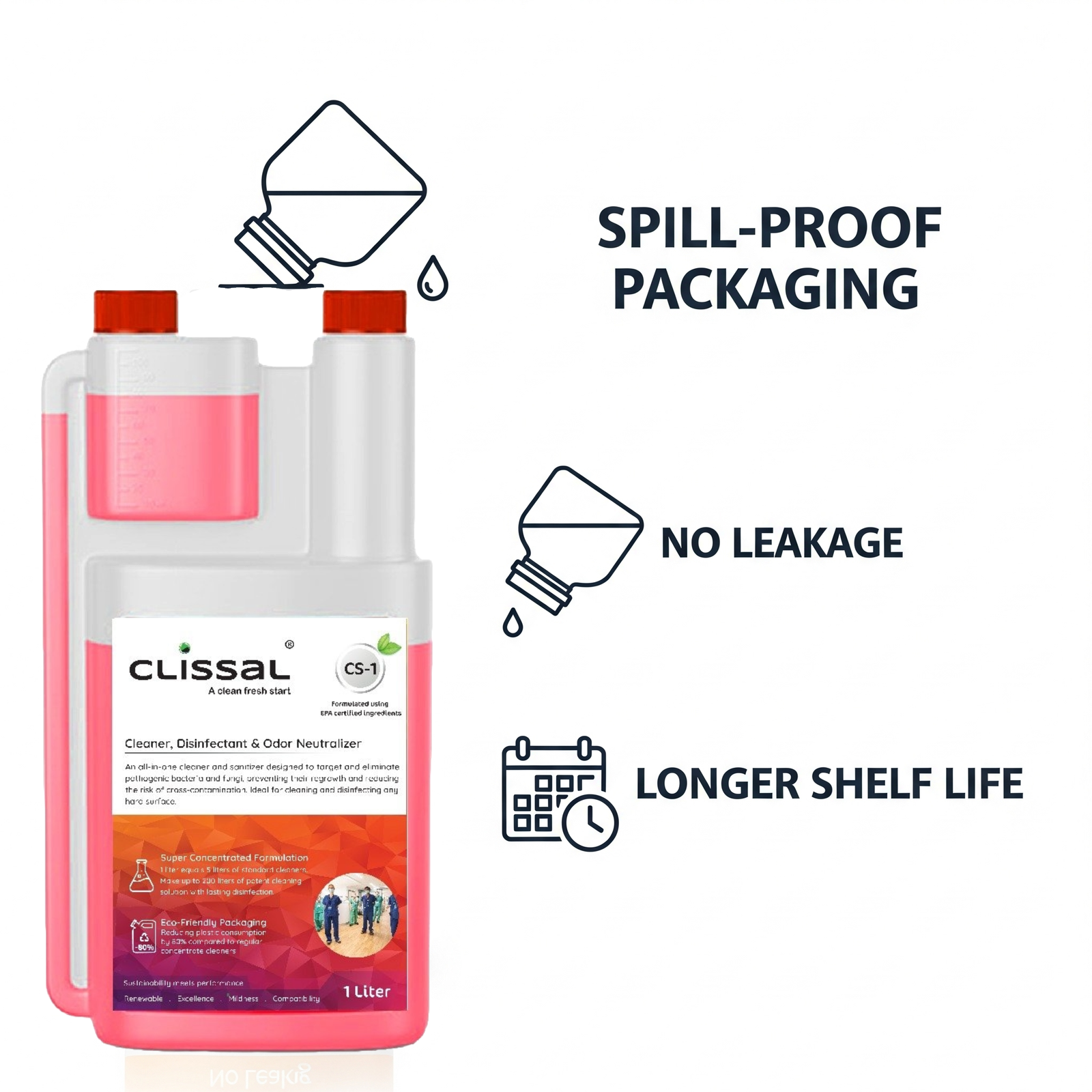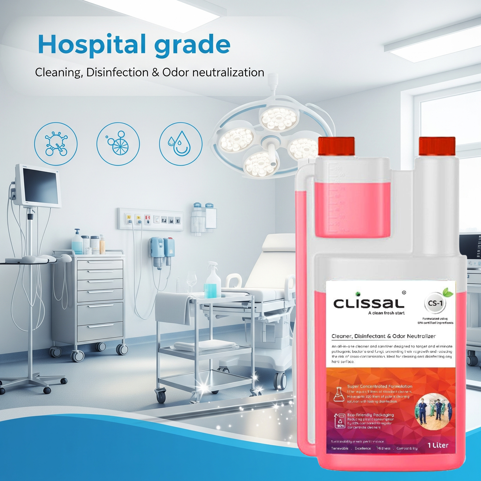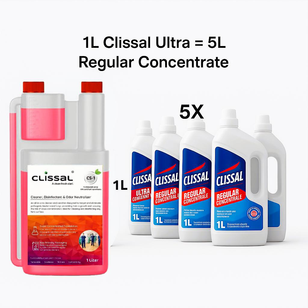 Clissal CS1 Multi-Surface Cleaner, Broad-Spectrum Sanitizer & Disinfectant – 1L Concentrate Makes 200L RTU | Odor Neutralizer for Bathrooms, Clinics & High-Traffic Areas